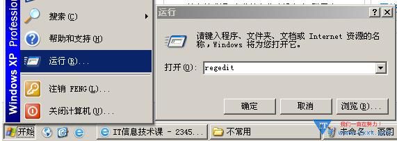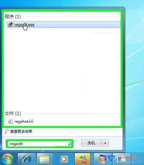 - 首先,请点击屏幕左下角的开始图标,在搜索程序和文件的输入框中输入regedit命令,这样我们可以在上方的程序列表中找到regedit.exe这个注册表编辑工具,点击该工具即可打开注册表编辑器,若我们收到用户账户控制提示,点击是即可。XP入口: