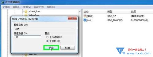 - 项中我们可以创建新的键值,键值的类型有字符串,二进制,DWORD,QWORD,多字符串以及可扩充字符串值等类型,选择恰当的类型后即可创建键值,比如我们可以创建一个名为test的DWORD值。双击该值,我们可以进行修改,删除和重命名等操作。选择修改,我们就可以对键值的数值数据进行修改。这里需要注意的是我们需要输入的值是十进制还是十六进制数据,请选择恰当的进制,并填入数值数据,比如这里填入100,之后点击确定即可。