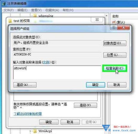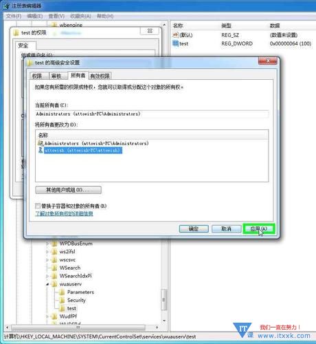 - 在权限窗口中我们可以了解到当前已有的用户组合用户名以及他们对此注册表项的相关权限,如果仅有读取权限,那么我们是无法进行修改等操作的。此时,请先点击高级,然后点击所有者。确认当前项的所有者,然后我们可以更改所有者为当前的登录账户。在此例中,计算机当前的登录用户是attowish,我们选中这个账户,点击应用和确定即可。