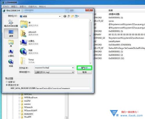 - 请右键所需备份的注册表项,选择导出,请选择导出的路径,比如桌面,并未文件命名,命名主要是为了帮助我们辨别不同的备份文件,比如我们对wuauserv进行的备份就可以命名为wuauservbackup,然后点击保存即可。
